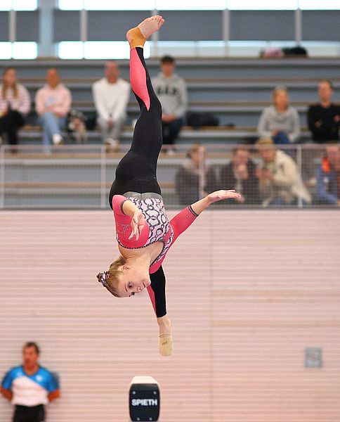 mit einigen Stürzen zu kämpfen. Auf dem Boden präsentierten die Turnerinnen ausdrucksstarke Übungen. Dennoch kosteten die strengen Bewertungen des Kampfgerichts und einige Schrittfehler wertvolle Punkte. Beste Turnerin war Mia Hoffmann mit einer 11,45. Am Sprung zeigten die Verbandsligistinnen solide Leistungen und erzielten insgesamt eine Punktzahl von 43,15. Am letzten Gerät, dem Stufenbarren ließen sie nach einigen Patzern allerdings Punkte liegen. Im Endeffekt erreichte das Team nur den 7. Platz, während Mia Hoffmann auf