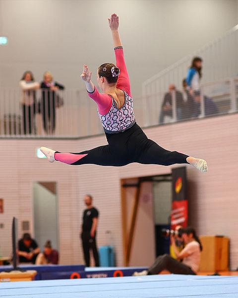 Das erste Gerät, der Boden, war geprägt von ausdrucksstarken Übungen der Turnerinnen, die nur kleinere Fehler zeigten. Besonders hervorzuheben ist hier Mia Hoffmann, die mit 11,75 Punkten die beste Leistung am Boden erzielte.